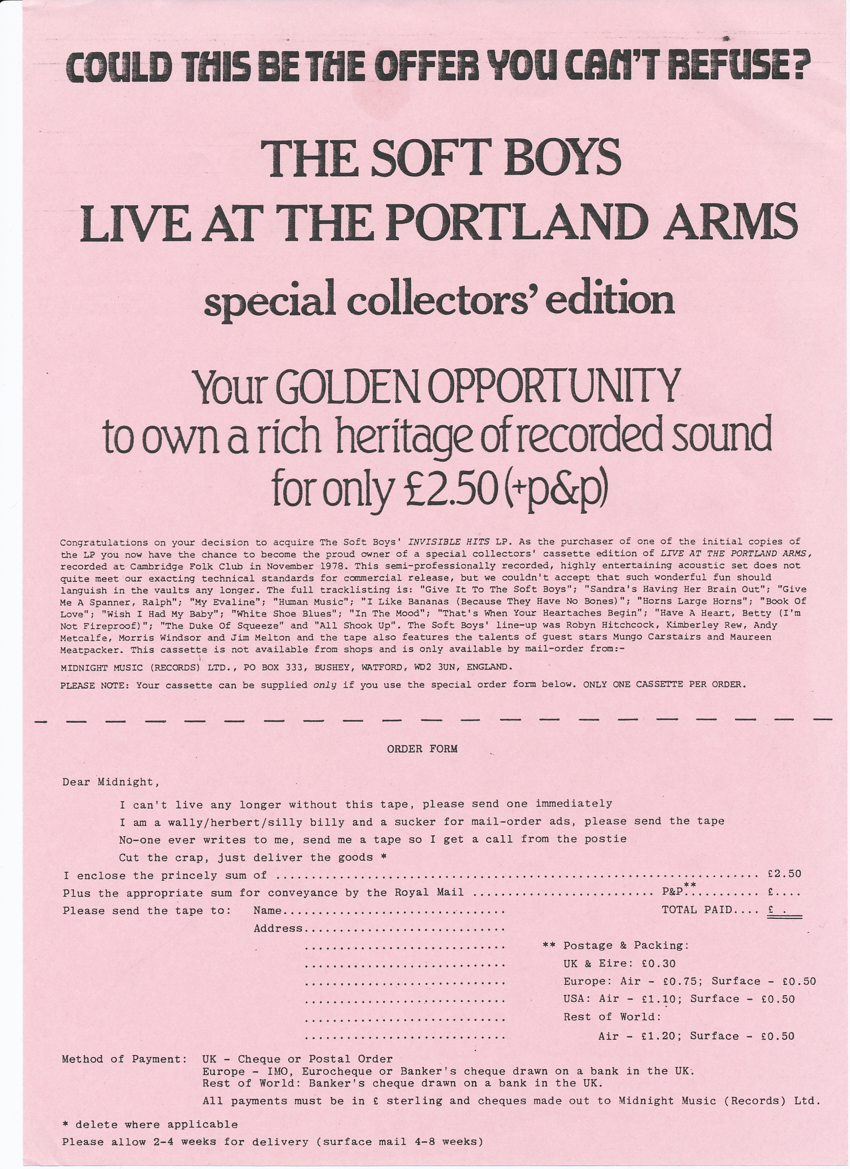 Included two order forms: one for T-shirts and another for the 'Live at the Portland Arms' cassette.