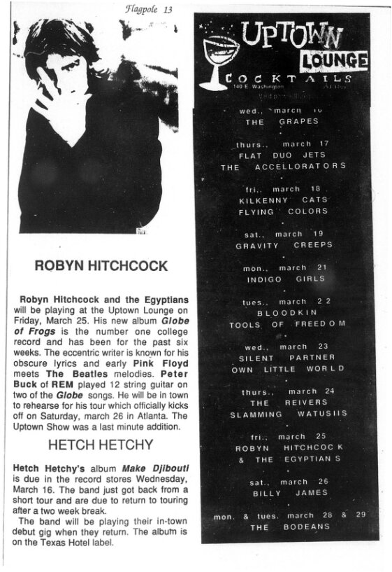 The Deep South has always been good to Hitchcock—particularly Athens. He recalls his earliest memories of performing in the Classic City in spring of 1988. “We played the old 40 Watt, back when it only had one lightbulb,” Hitchcock recalls. “I was with my band the Egyptians, supplemented by Peter Buck, who very kindly collected me from the Atlanta airport in his hearse.