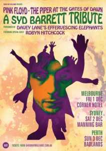 The Effervescing Elephants are Davey Lane (Guitar/Vox), You Am I’s Rusty Hopkinson (Drums), The Gin Club’s Dan Mansfield (Keyboards), Even’s Ashley Naylor and very special guest Robyn Hitchcock (Guitar/Vox)