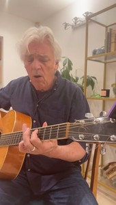 Robyn played the recent ‘Sir Tommy Shovell’ from Shufflemania! Switching to an open G tuning, He played a very pretty ‘San Francisco Patrol’ from The Man Upstairs. Next was a pensive version of ‘Raymond Chandler Evening’ from Element Of Light. Also by request: The Beatles’ ‘I Saw Her Standing There.’ As RH played, Ringo chewed on the plant behind him and Tubby sat on the stool next to him, framing him like cat parentheses.