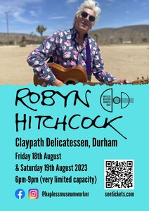 The venue was a tiny delicatessen just off the main drag in Durham City, County Durham North East England. About fifty people attended, which was probably full capacity. Seating was available for half of the audience. I was slightly nervous about the delicatessen being used as a live music venue. Especially having seen some YouTube clips of gigs held there. I feared that attendees would witness a strange southern bloke performing in a cramped space, with eager punters caring only about being served with their lattes, focaccia or sourdough. Thankfully, my notion proved completely inaccurate and unfounded! The venue is a lovely intimate space to host gigs. Although, freshly baked grub was available! The audience was formed by a mixture of local regulars and staunch fans, and I saw a couple of men dressed in Robyn Hitchcock T-Shirts. It was the first gig that Robyn played since the tragic death of his daughter last Wednesday.