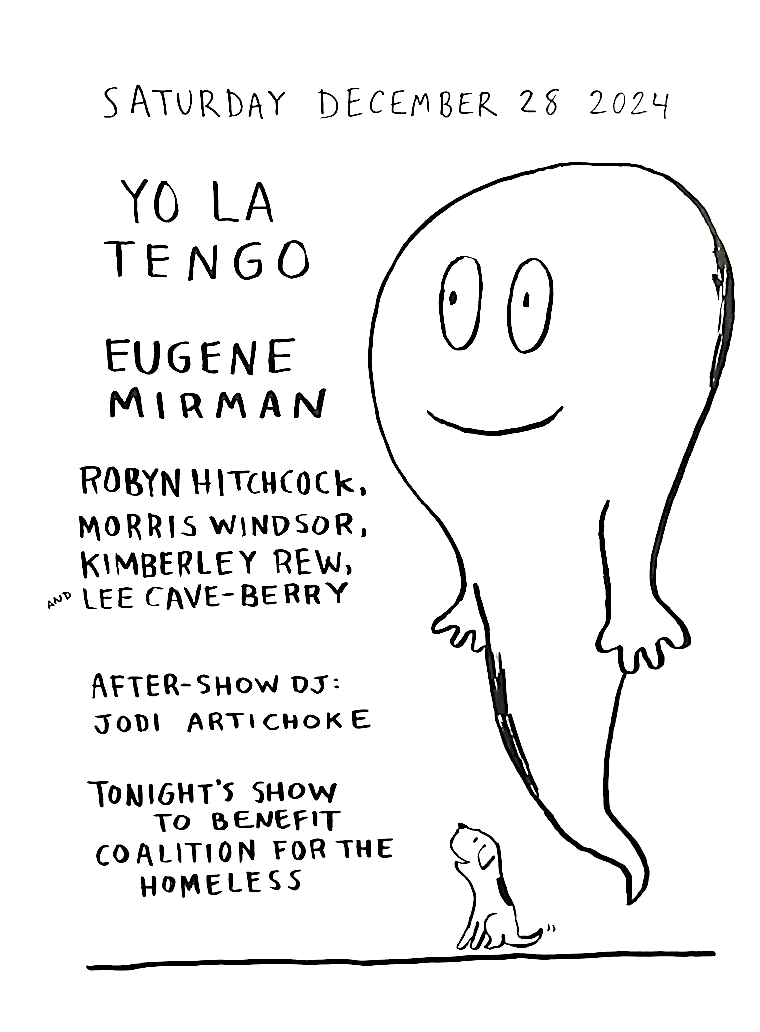 Eugene Mirman, who is old friends with both Yo La Tengo and Robyn Hitchcock, was the night’s comedian; YLT’s Georgia Hubley made the mix CD sold at the merch table; and Jodi Artichoke was the post-show DJ. Proceeds benefited Coalition for the Homeless.