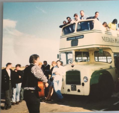 This page departs from the format of the main site, and exists to commemorate the best 'gig' I have ever been to. In August 1996, Robyn Hitchcock chartered two vintage double-decker buses and allowed a few dozen lucky ticket holders to accompany him on a drive around the western tip of the Isle of Wight, stopping off to play songs en-route.